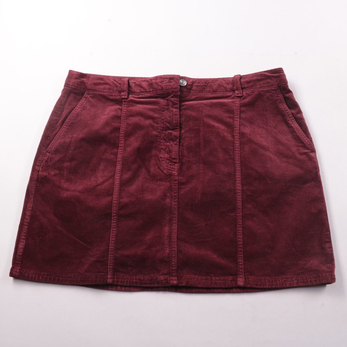 Вельветовая юбка Per Una (M&S) бордового цвета, короткая, с застёжкой на пуговицу и боковыми карманами. Подойдёт для повседневных образов в межсезонье и прохладным летом. Плотный вельвет хорошо держит форму и меньше мнётся.